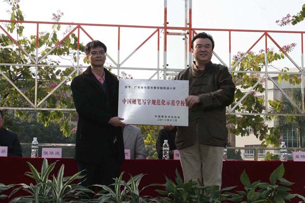 2012年12月24日,中国硬笔书法协会主席、中国书协硬笔书法工委副主任、清华大学美术学院教授张华庆,中国硬笔书法协会主席团委员兼常务副秘书长柳长忠等领导莅临东莞市,为寮步镇西溪小学颁授“中国硬笔写字规范化示范学校”牌匾,东莞寮步镇宣传文体局副局长、科教办主任钟应芬,寮步镇科教办副主任颜华锋、科教办艺术科辅导员谭贵新及西溪小学全体师生出席授牌仪式。